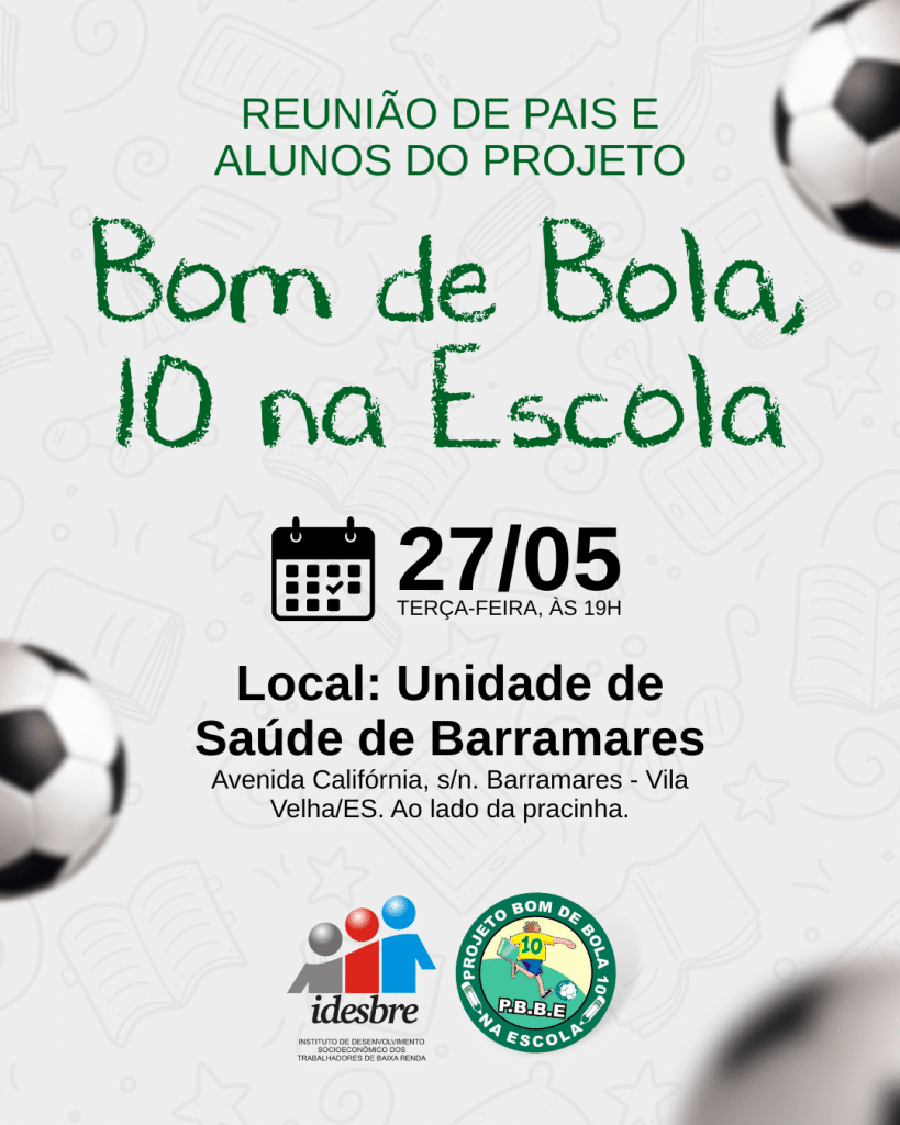 ATENÇÃO, PARTICIPANTES DO BOM DE BOLA, 10 NA ESCOLA! ⚽🧒🏿👧🏾 Na próxima terça-feira, 27 de maio, acontecerá a reunião de pais e alunos do projeto, às 19 horas, em Barramares. Convidamos todos os pais e responsáveis para participarem desse momento importante conosco. Sua presença fortalece o nosso time! Já anota a data para não esquecer […]